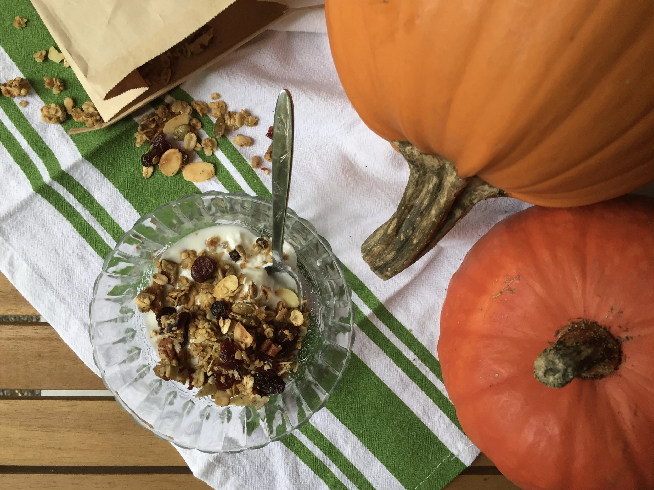 Pour l’automne, je vous propose un granolas composé d’un savoureux mélange de grains, mettant en valeur l’avoine, les canneberges et les cassis séchées, le tout enrobé de purée de citrouille, de sirop d’érable et du mélange d’épice d’automne.